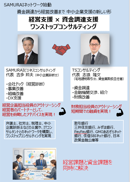 企業経営における理論や手法は時代を経て変化していますが、企業は人が運営するものであり、最も大切な経営資源は人材であることには変わりはありません。企業経営においては普遍的な原理原則から、テクノロジーの発達による最新技術の活用など、合理的な運営も必要です。そして、企業経営には人類の歴史のなかで見いだされたセオリー(確立された方法)が存在します。国内企業の大半は中小企業であり、中小企業が繁栄することが日本経済繫栄に繋がります。「SAMURAIコンサルティング」は士業を中心とするコンサルタントとネットワークを構築しています。そして、士道に基づき道義を重んじた武士のように高潔な信念を持って顧客に接し、信頼できるパートナーとなることを目指してまいります。