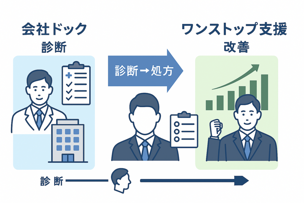 会社ドック:診断(現状把握)⇒ワンストップコンサルティング:治療(改善実行)
